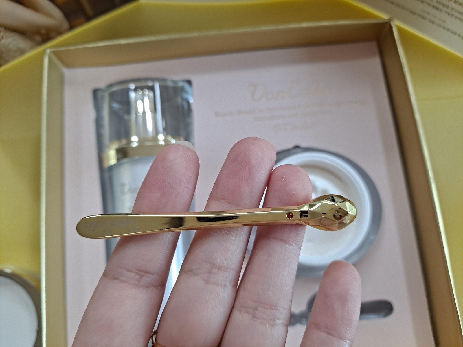 세럼과 크림이 움직이지 않게 잘 고정되어 있고, 크림을 덜어 쓸 때 사용하는 스파츌라가 함께 들어있습니다. 왠지 모르게 고급 져 보이는 스파츌라가 부족해 보이는 무언가를 잡아 준거 같아요.
